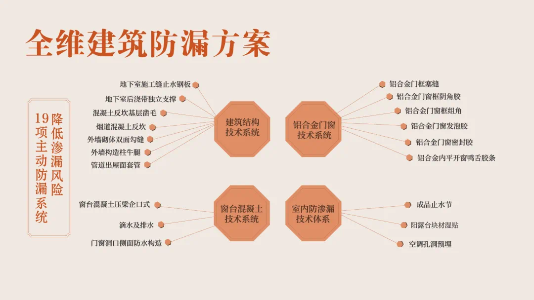 外有禅意美学,内有精工硬核,我们严格打造19项全维建筑防漏系统,降低房屋的渗漏风险,涵盖:建筑结构、铝合金门窗、,窗台混凝土、室内防渗漏四大技术系统,如:我们对卫生间的地面基层均做好凿毛处理,墙根部位亦设置了混凝土的反坎,有效反渗漏,避免卫生间墙角发霉,保持健康舒适的生活环境,一道道工艺工序筑起的隐形壁垒,予您无忧生活。