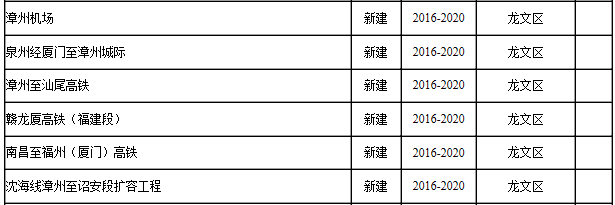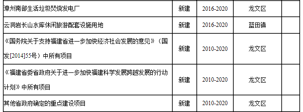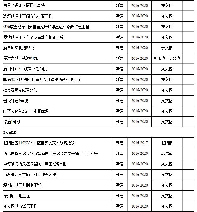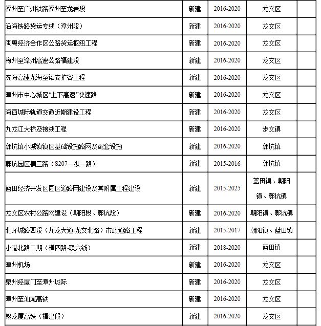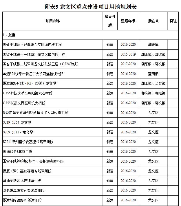 基础设施用地规划表显示:在交通用地布局方面,完善综合交通运输网络。重点安排厦漳城际铁路R2、R3线和国省干线联六线、联十一线国境过境公路建设;加快石仓北路、龙祥中路、石仓南路、龙文南路、建元东路等一批城市干道建设,完善中心城区路网建设,提高城市运行效率和城市化水平;加强城区对外交通与内部道路衔接,推进北环城路、东环城路及接线工程、联东大桥及引道工程等项目以及朝阳北部片区路网建设;扩大公交覆盖范围,优化延伸公交线路,加快海峡物流城公交枢纽、公交东部枢纽、公交樟山首末站等公交站场建设。